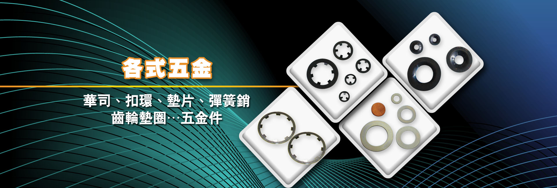 彈簧梢,止輪扣環,側插鍵扣環,快速螺帽,波浪華司,齒華司,R型插梢,內外齒華司,盤型彈簧華司,弓型彈簧華司,夾片(汽車、自攻螺絲、機械螺絲用),機械用平鍵/單圓鍵/雙圓鍵,不鏽鋼短鍵,單頭圓鍵,雙頭圓鍵,帶頭斜鍵,斜鍵,各類墊片
